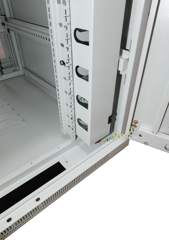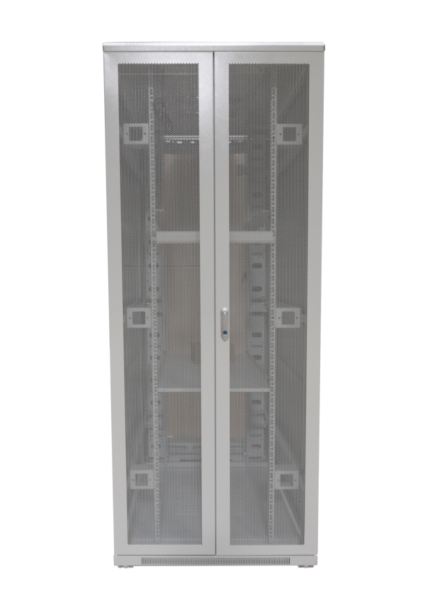 Schrank vormontiert, H2000/B800/T1010mm, Nutztiefe 850mm, Lichtgrau RAL7035, 4xLochrasterprofile 19" (Vorder/Rückseite) mit Einteilung der Höheneinheiten, 1xperforierte Blechfronttüre 1-teilig mit Schloss, 1xperforierte Blechrücktüre 2-teilig mit Schloss, 2xSeitenteile abnehmbar mit Schloss, verstellbare Füße(H20-70mm), 1xpaar L-Winkel T750/B40/H40mm (Nutzbreite 450mm), 1xZwischenboden T750/B470/H45mm (Nutzbreite 450mm), 1xKabelführungsplatte mit Abdeckung, 4xLüfter mit Thermostat, 20xKäfigmutter mit Schrauben, Schrank komplett zerlegbar, 19"Profilabstand(vorne/hinten) 800mm(veränderbar bis 880mm, in Schritten von 20mm), Erdungsbolzen M6(Türen mit Erdungskabel), Kabeleingang mit Bürstenleiste oben(vorne/hinten) und unten(vorne,mittig,hinten), Türen umbaubar(links/rechts), Patchraum vorne 75mm, ohne Sockel, incl. Rollenset(2x mit/2x ohne Feststeller)