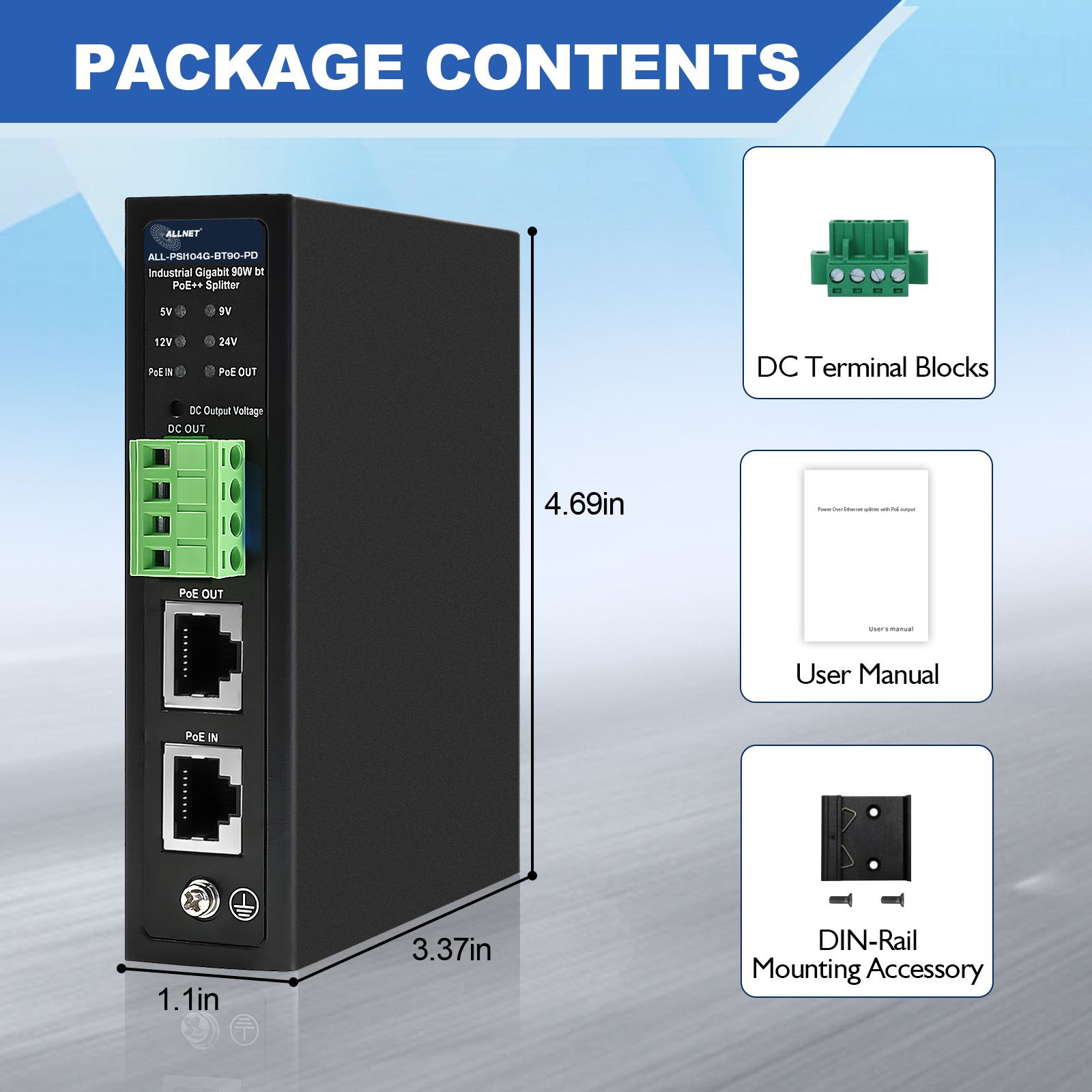 ALLNET PoE Splitter/Extractor industrial • 1x GbE PoE BT IN • 1x GbE PoE Out • 5V/9V/12V/24V adjustable • DIN-Rail • ALL-PSI104G-BT90-PD