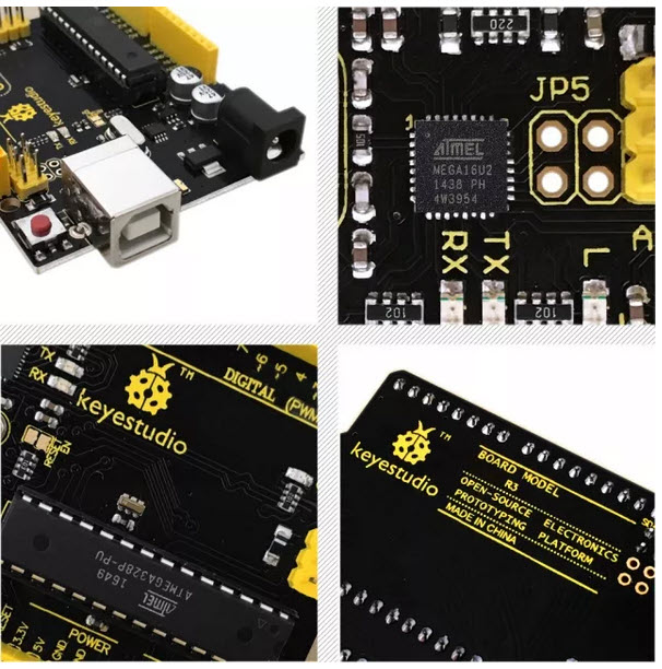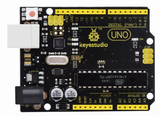 KEYESTUDIO UNO R3 is a microcontroller board based on the ATmega328. It has 14 digital input/output pins (of which 6 can be used as PWM outputs), 6 analo g inputs, a 16 MHz ceramic resonator, a USB connection, a power jack, an ICSP header, and a reset button. It contains everything needed to support the microcontroller; simply connect it to a computer with a USB cable or power it with a AC-to-DC adapter or battery to get started.
