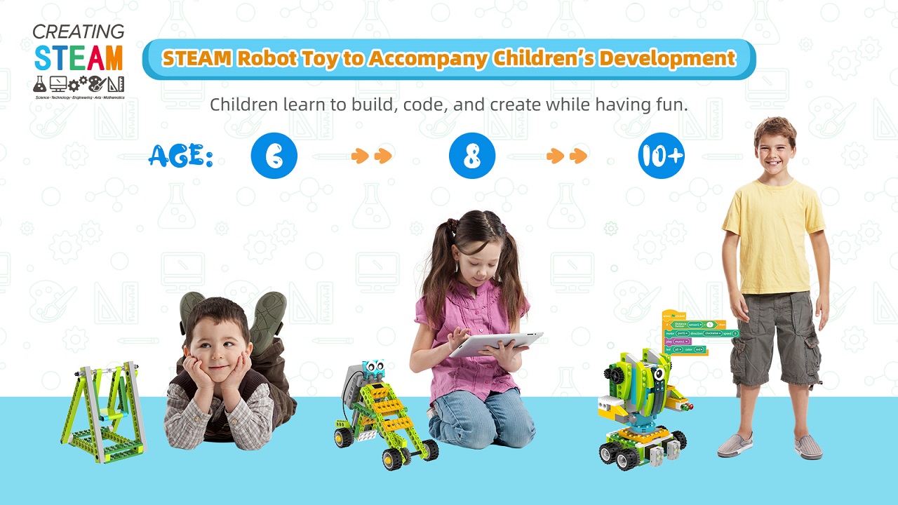 Kinder werden lernen, zu programmieren und kreative Problemlösungsfähigkeiten zu entwickeln, während sie mit diesem interaktiven Lernspielzeug mit grafischer Programmierung spielen, so einfach wie ein Drag-and-Drop-Spiel. Sie können dieses technische Spielzeug auch mit APP-Steuerung zum Leben erwecken.