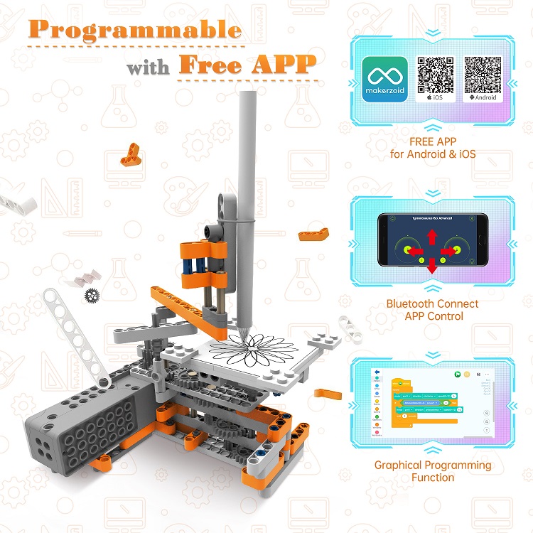 Mit der KOSTENLOSEN MAKZERZOID-App aus dem App Store und Google Play, über die Blauzahn-Verbindung mit intelligenten Geräten, können Kinder die Modelle leicht aus dem "Build"-Bereich bauen und dann den motorisierten Roboter steuern, um sich in alle Richtungen zu bewegen, die so viel Freude bringen.