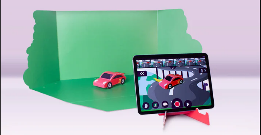 Piximakey Studio Starter-Set „Greenscreen“, Spielset mit Ständer, Figuren und Hintergründen