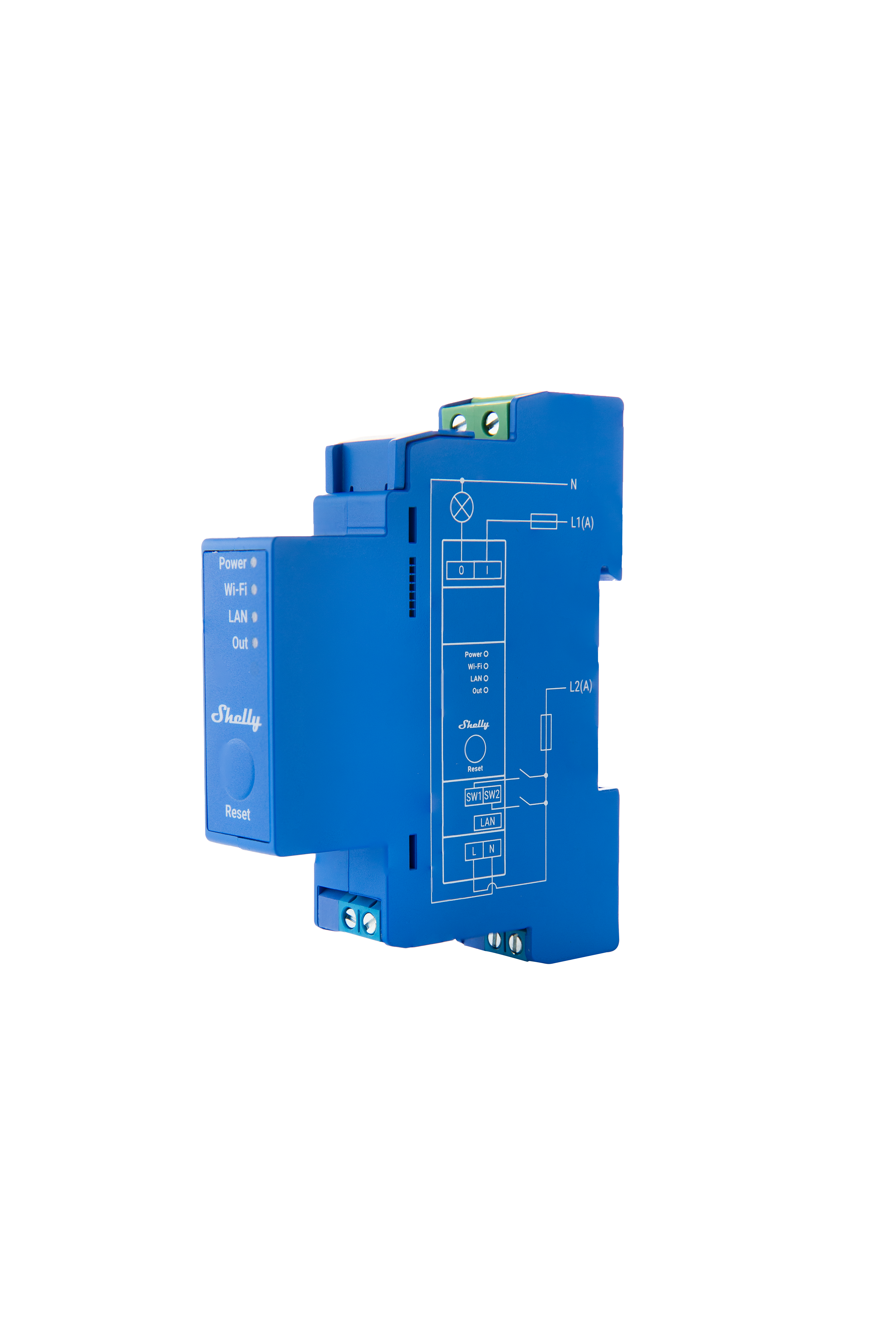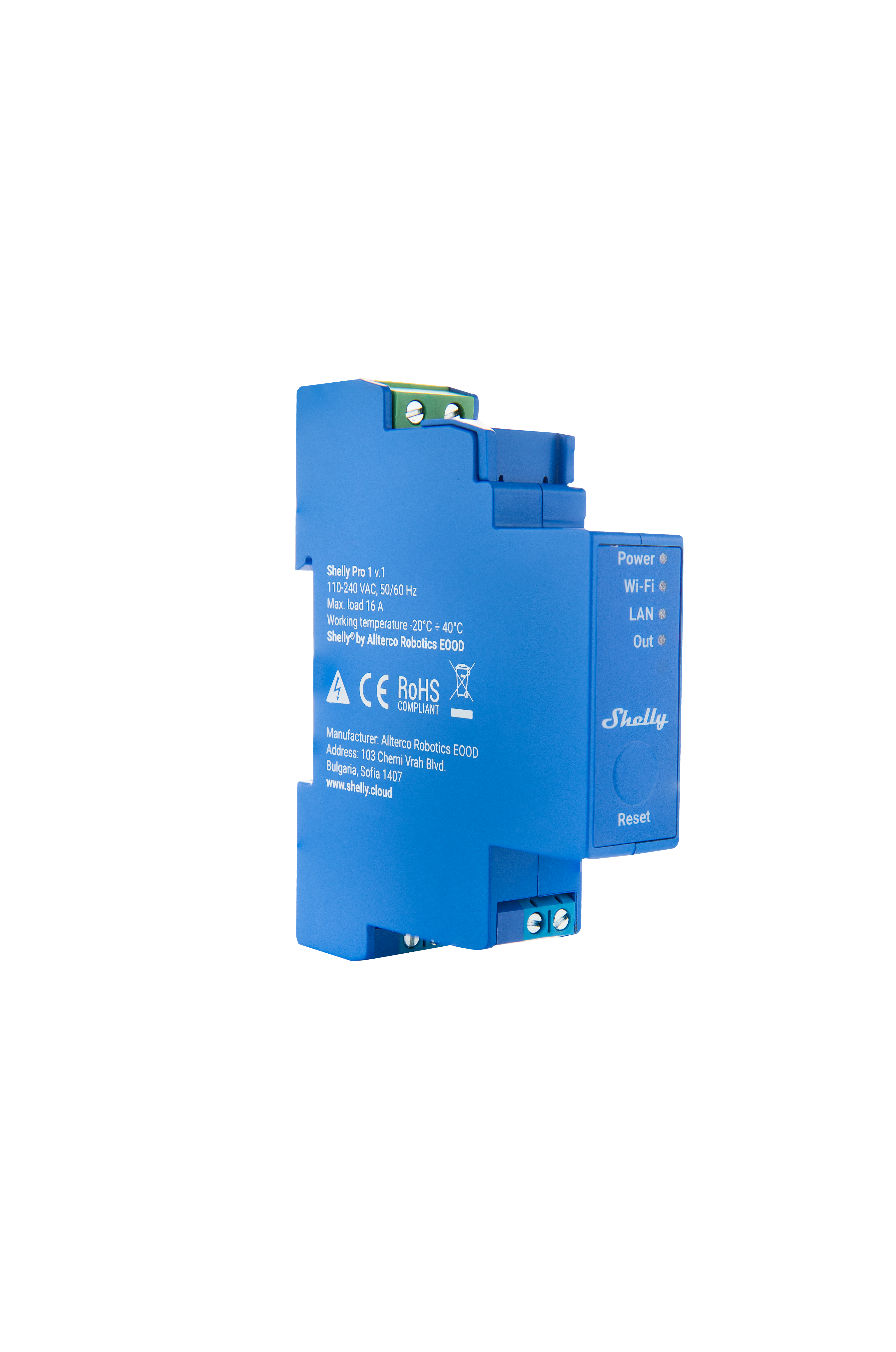 Shelly Pro 1 is a one-phase, 1 channel relay supporting up to 16 A for professional lights and appliance automation in residential or commercial applications. It is equipped with potential-free outputs (dry contacts) offering high flexibility in voltage support and applications. Shelly Pro 1 has scripting functionalities for custom automation scenes based on external data or various occurrences.