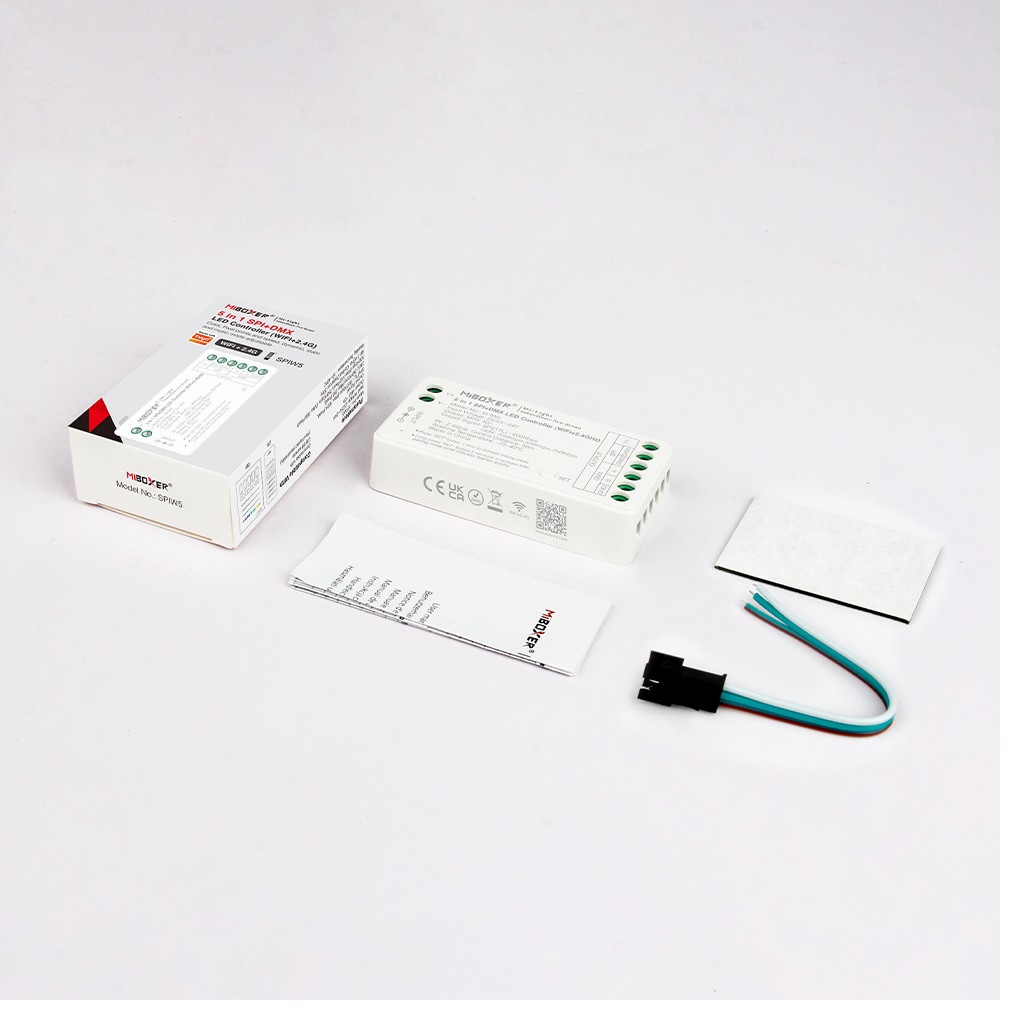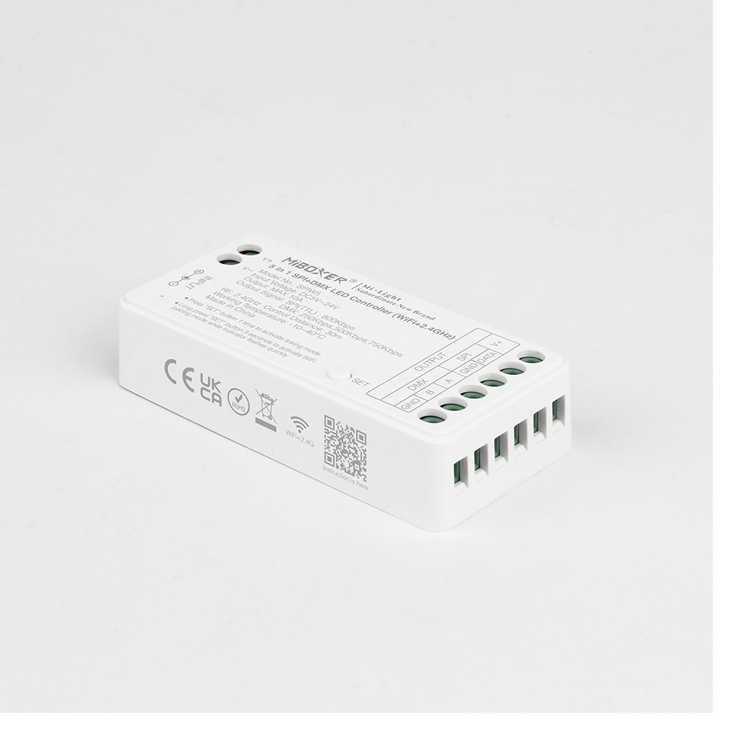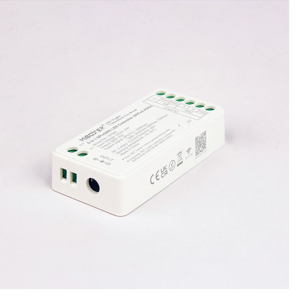 SPIW5 5 in 1 SPI+DMX Wifi+2.4G LED-Controller ist in SPI/DMX Dual-Kommunikationsprotokoll, kompatibel mit DC5-24V Eingang, es ist spezielle Controller für SPI LED-Streifen Licht gebaut. Der Controller unterstützt Wifi +2.4G drahtlose Übertragungstechnologie