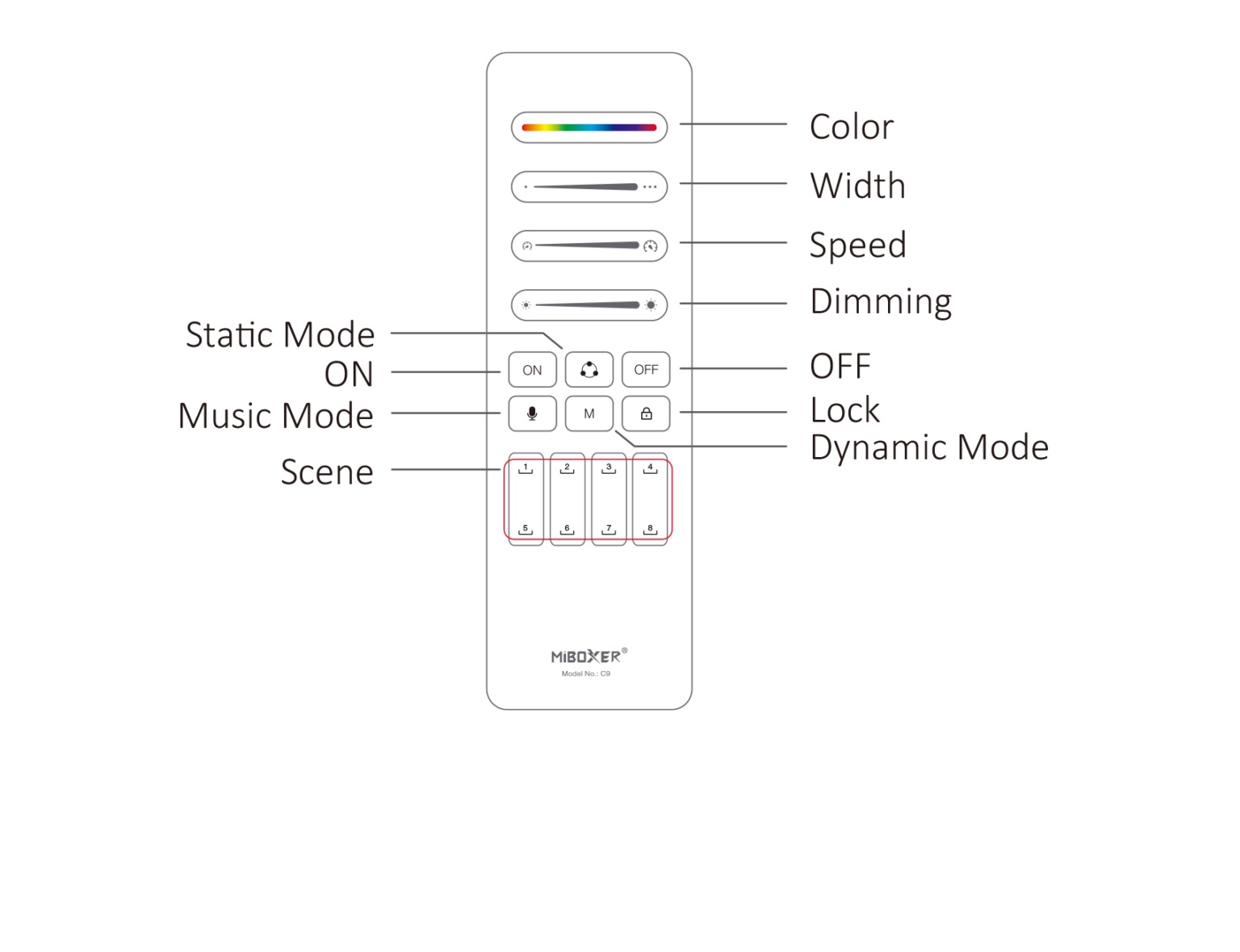 Richten Sie die Farbe aus und stellen Sie die Länge (Anzahl der Pixel pt) des SPI-Streifens ein, wählen Sie den dynamischen Modus und steuern Sie die Geschwindigkeit, sparen Sie die Szene 2.4G drahtlose Übertragungstechnologie mit schneller Geschwindigkeit für die Übertragung, stabiles Signal und starke Fähigkeit für Anti-Interferenz