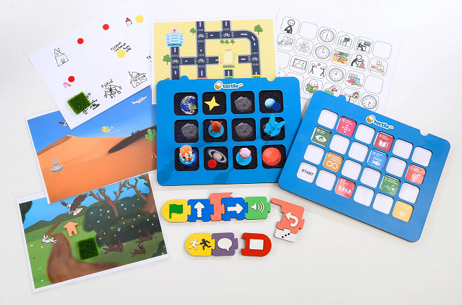Das Kit Tactile Jr ist ein umfassendes Lernangebot, das physische Materialien, Figuren und interaktive Spielbretter kombiniert, um Kindern spielerisch einen Einstieg in Programmierung, Logik und Kreativität zu ermöglichen.
