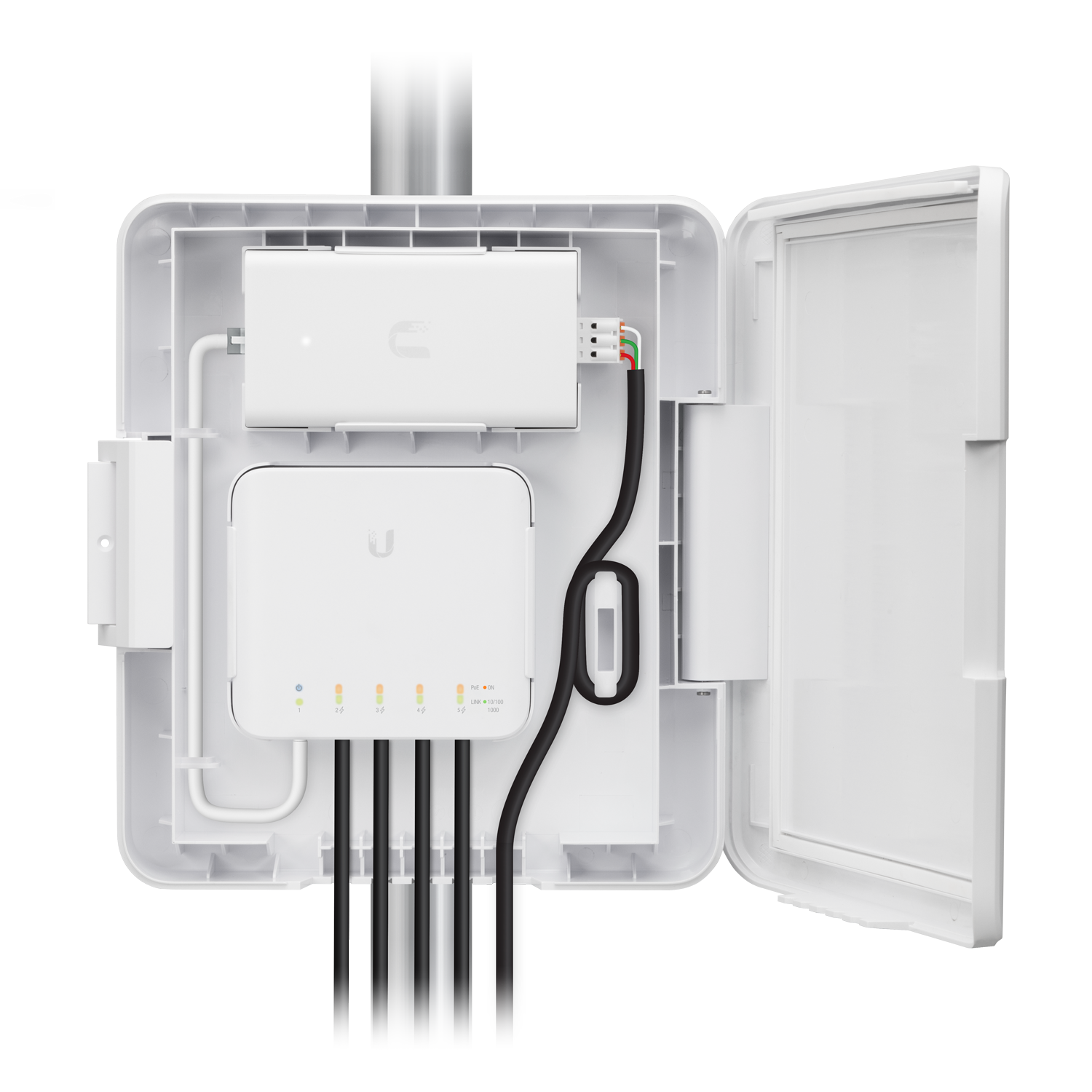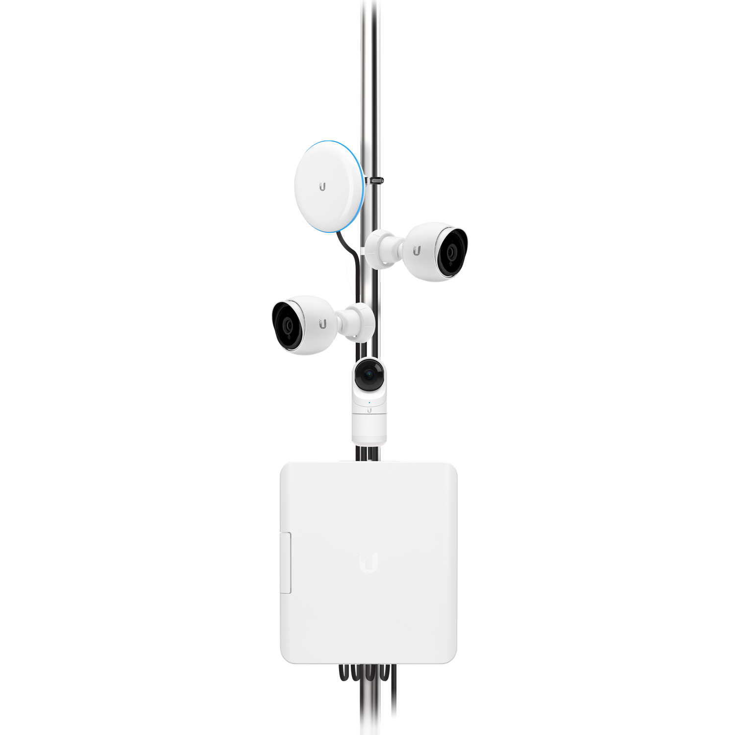 Das USW Flex Utility kann einfach an einer Stange montiert werden und bietet aus Sicherheitsgründen ein sauberes Kabelmanagement und eine Schraubensicherung.