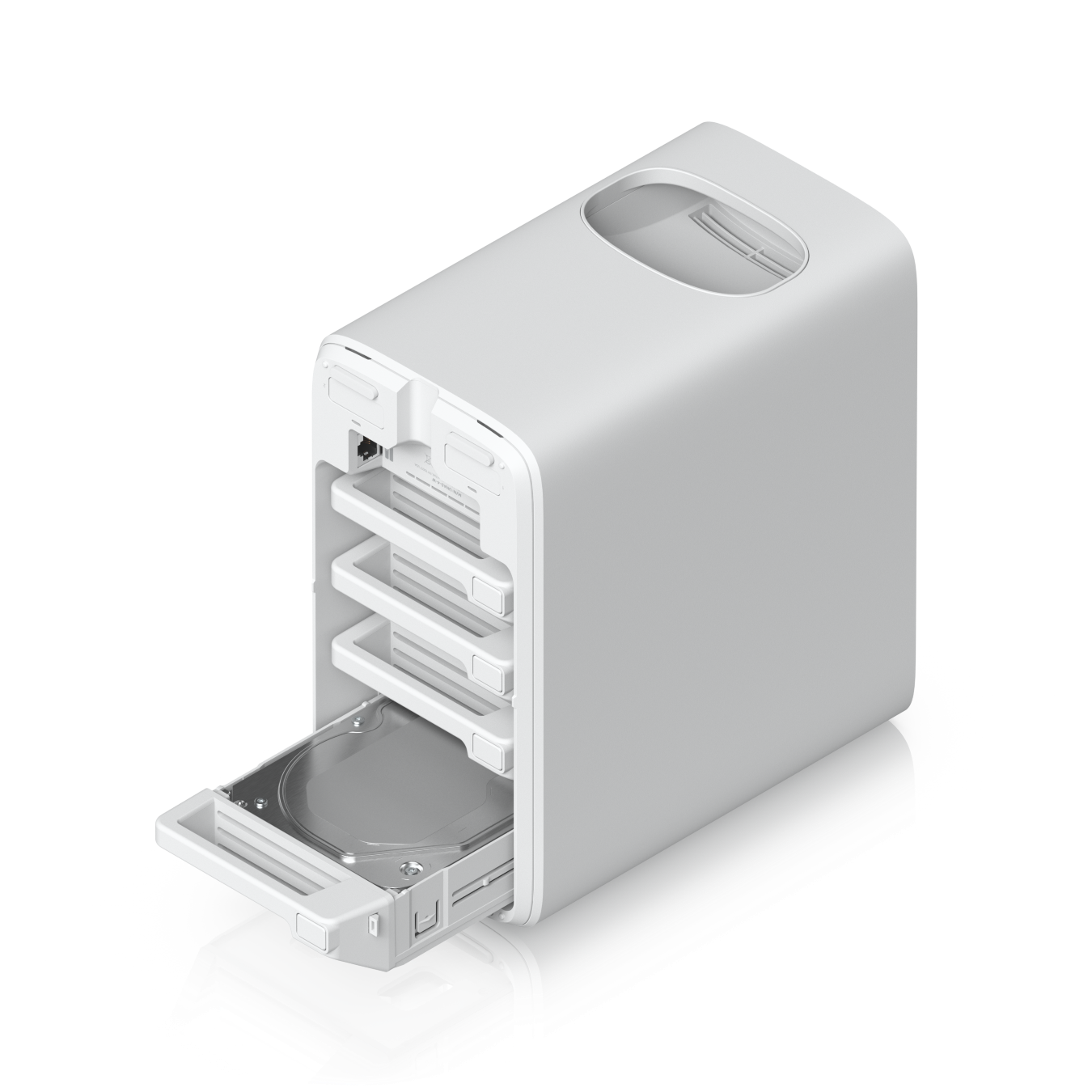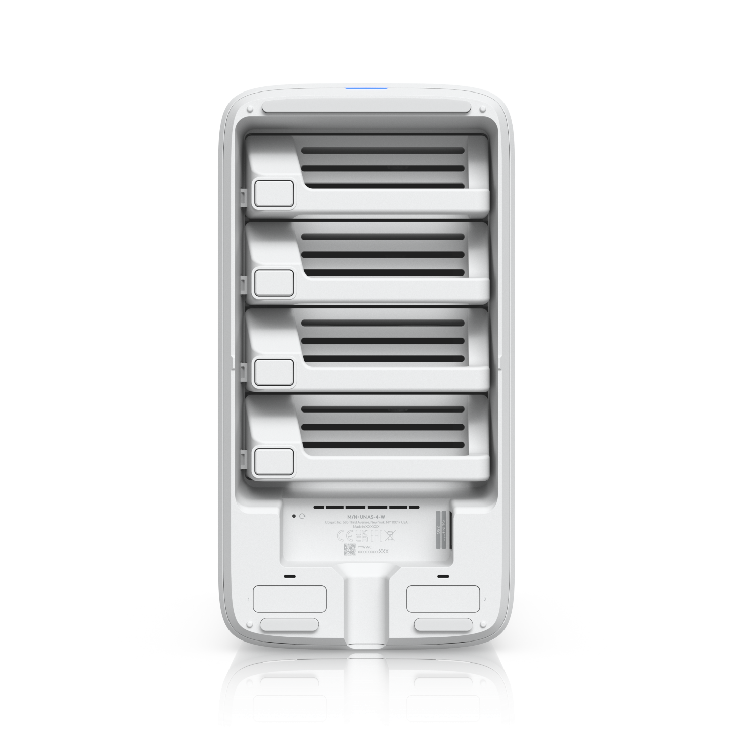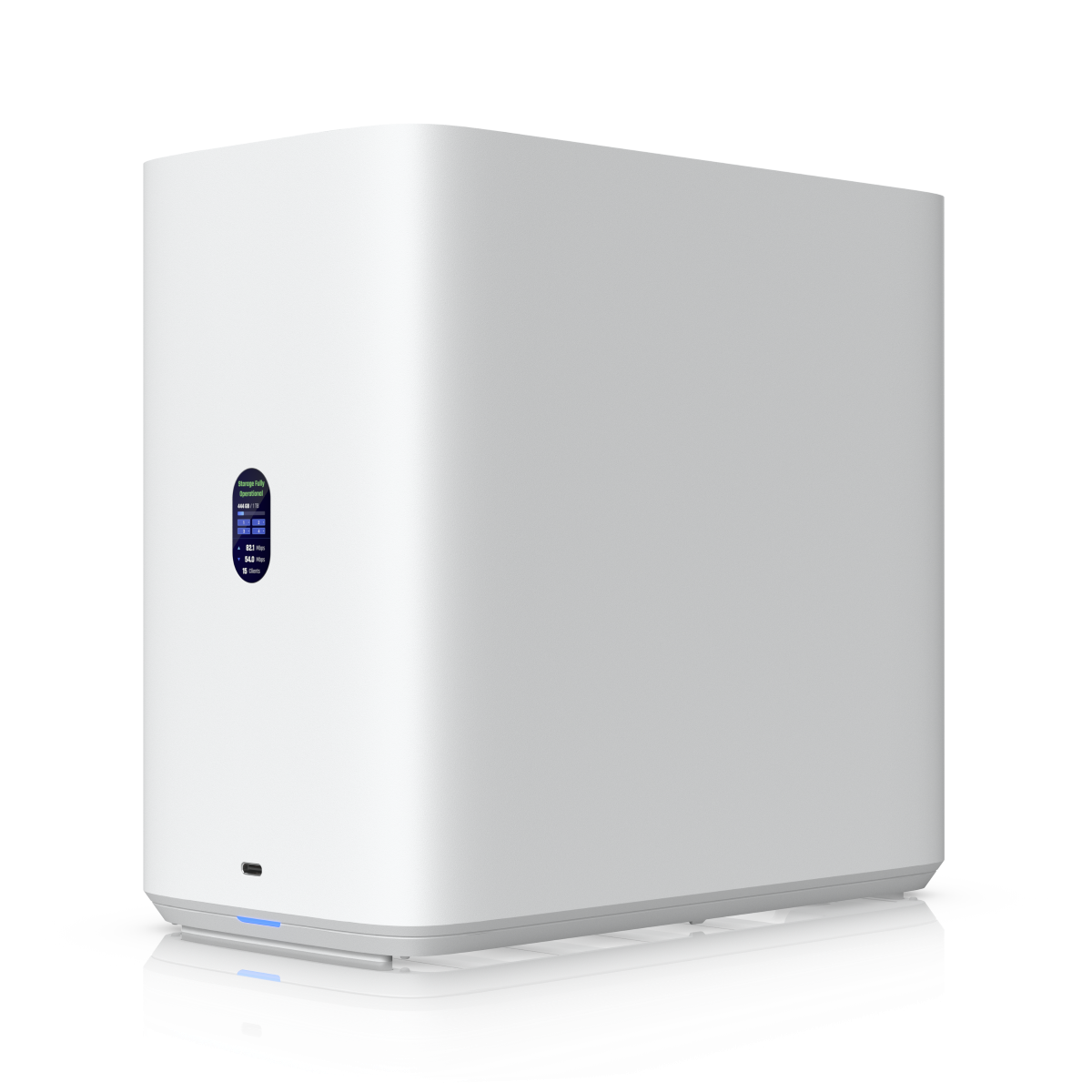 UniFi Network Attached Storage with (4) 2.5/3.5-inch HDD bays, (2) M.2 NVMe SSD cache slots, 2.5 GbE network, USB-C connectivity and an included PoE+++ adapter, all in a compact space.